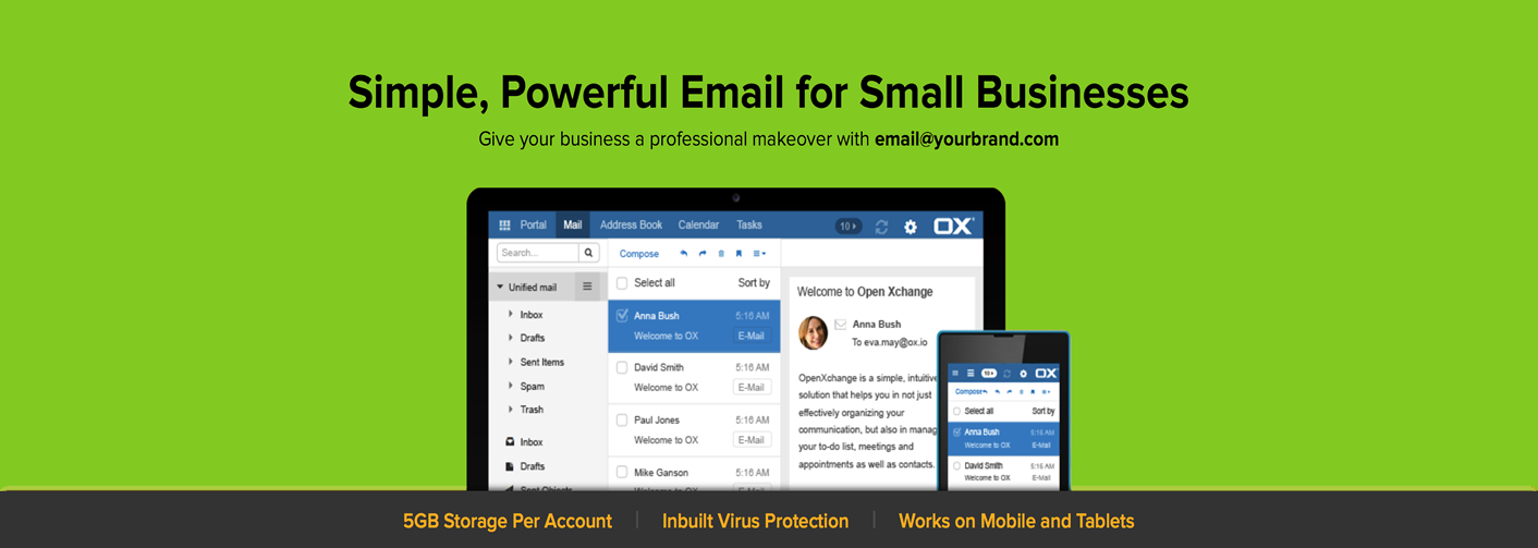 Intuitive interface design powered by OpenXchange that can be accessed from your smart phone.